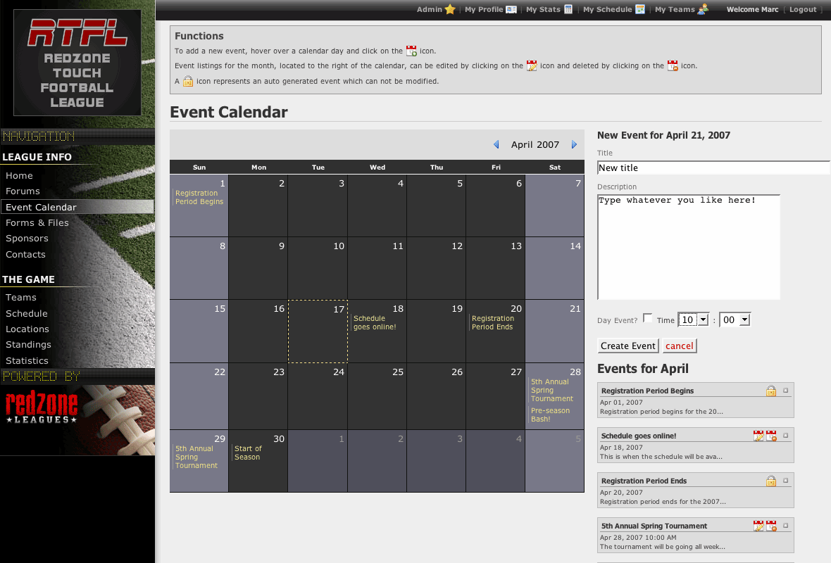 Events such as season registration dates and the start of a season are automatically created and presented in the calendar. If you change your registration dates, the associated "auto" events reflect the change instantly -- no need for the user to keep things in sync.